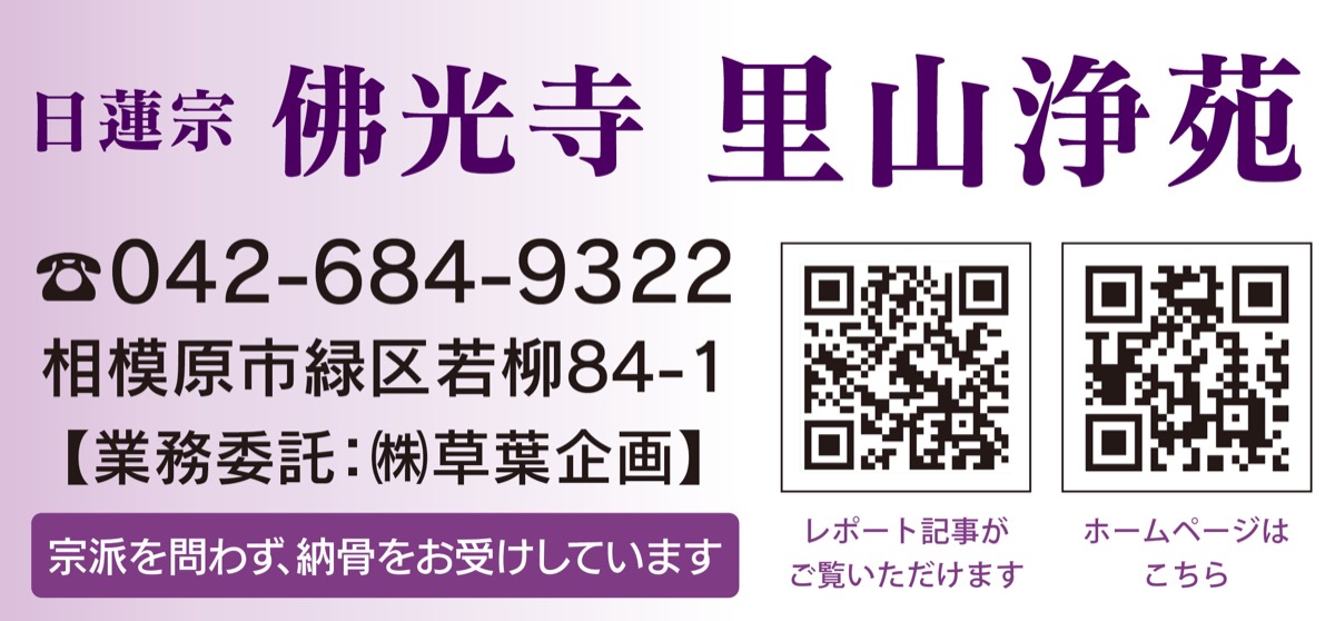 雄大な自然に恵まれた相模湖のほとりに佇む、日蓮宗 法榮山 佛光寺。季節ごとに花々が咲き誇り、奥高尾の山並みが一望できる同寺には、癒しのひと時を求めて多くの人が訪れる。そんな四季の彩り豊かな同寺の境内に、近年、注目される樹木墓(樹木葬)や永代供養墓(合同墓)を取り扱う「里山浄苑」(業務委託・草葉企画)がある。