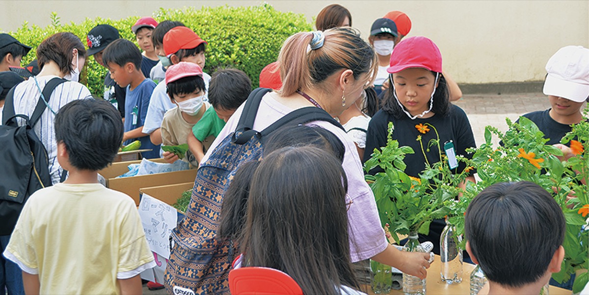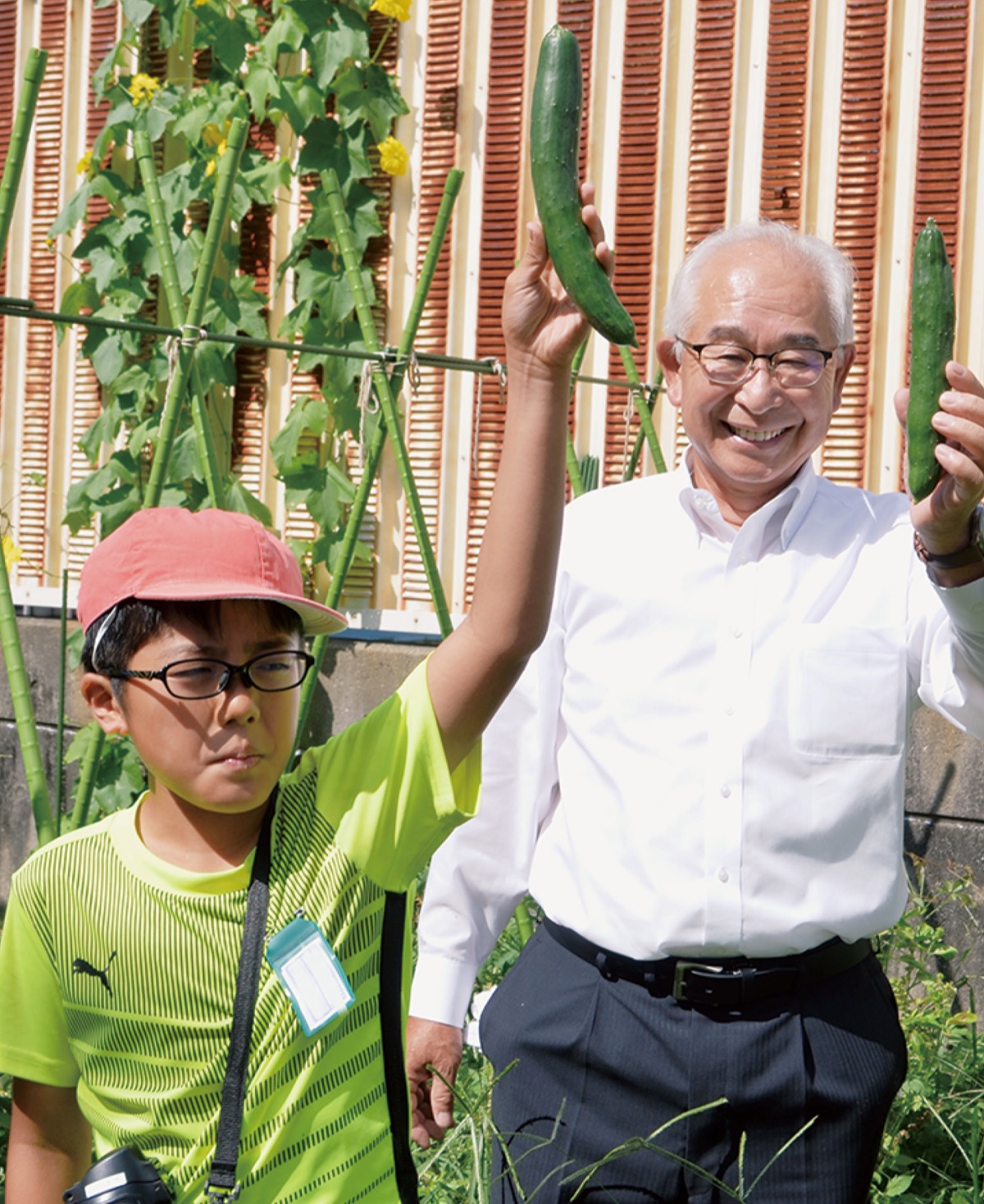 6月に種まきした野菜は大きな実となり収穫時に。まず、JAの中里州克組合長と代表の児童が一緒にキュウリのつるにはさみを入れ、収穫。ほかの児童もそれに続いた。その後、収穫したキュウリやナス、バジルなどを、相模原のまちのコイン『すもー』で地域の人と交換。約5000すもー集まったという。