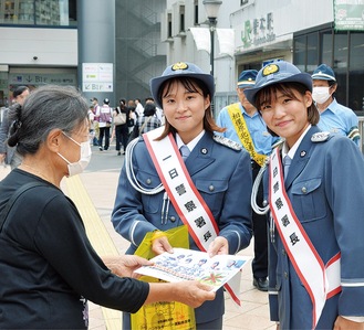 当日はキックボクサーで格闘技団体RISE で活躍する宮崎若菜さん、小雪さん姉妹が一日警察署長としてキャンペーンに参加。姉の若菜さんは「交通事故で悲しい思いをする人がいなくなるように啓発をがんばりたい」、妹の小雪さんは「今日を機に1件でも事故が減るように声掛けしたい」と意気込むと、2人は外郭団体の会員らと共に歩行者や駅利用者に交通安全を呼び掛けた。