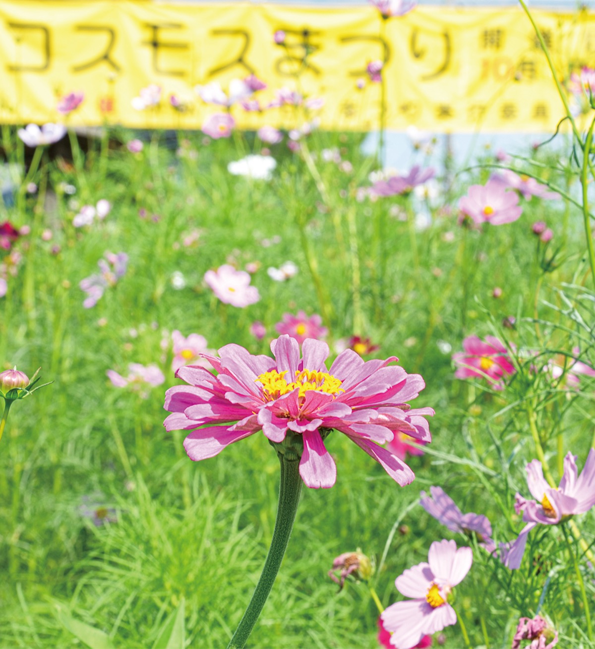 休耕農地を使い地域活性化のために植え始めたコスモス。7000平方メートルの畑に約50万本の花が咲き誇る。今年は猛暑の影響もあり雑草の成長が早く、実行委員会のメンバーが中心となり例年以上に草取りに手を焼いたと言う。「雑草は水分を持っていくから取っていかないとコスモスに影響がでてしまう」と会員。その成果もあり、今年は例年に比べ全体的に背が高めと言う。
