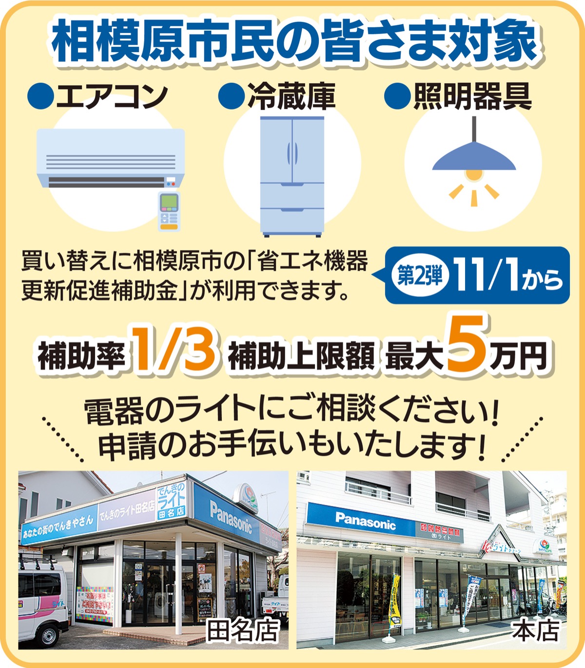 地元で人気の家電販売店「電器のライト」(田名店=田名/本店=中央)では、相模原市の一般家庭向け「省エネ機器更新促進補助金」第2弾が11月1日にスタートするのを控え、省エネ家電の取り揃えを強化している。