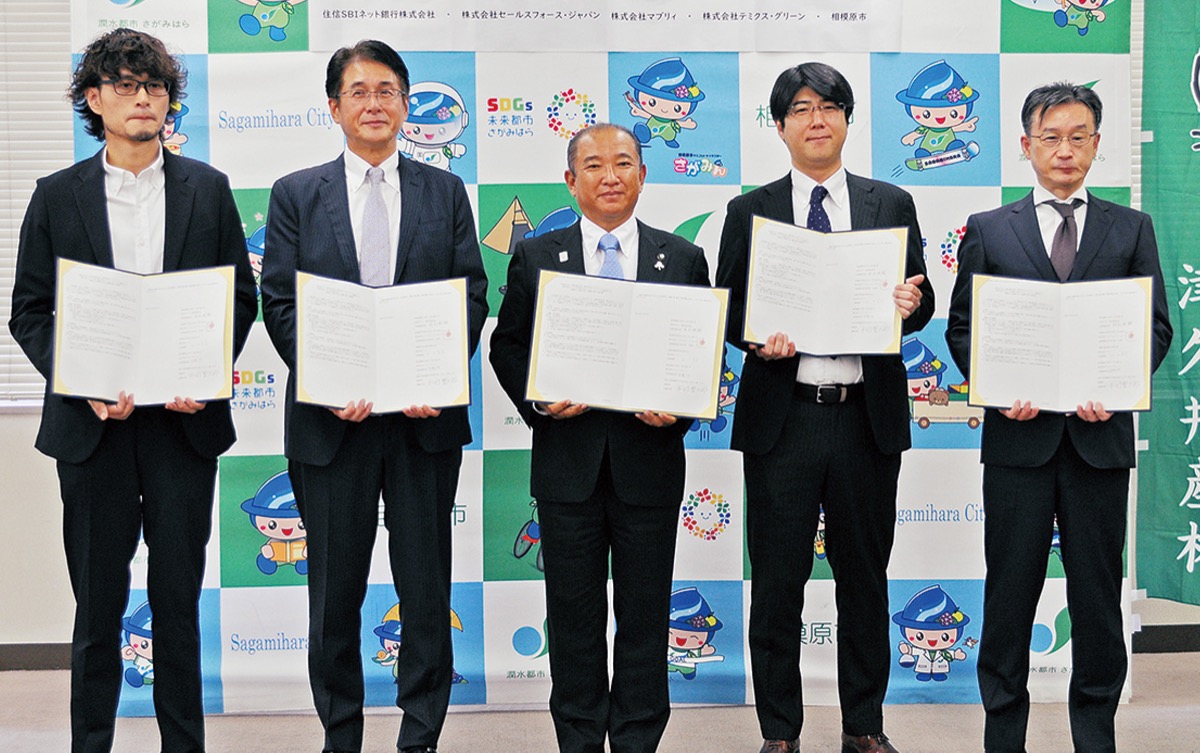 協定を締結したのは、相模原市と住信SBIネット銀行株式会社(銀行業)、株式会社セールスフォース・ジャパン(クラウドアプリケーションおよびクラウドプラットフォームの提供)、株式会社マプリィ(GISアプリケーションの開発など)、株式会社テミクス・グリーン(カーボンクレジットの売買・媒介)の4社。