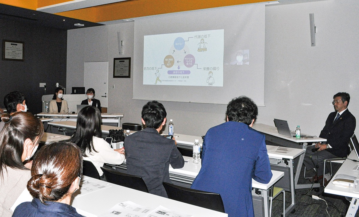 後半は歯科川崎医院が地域での栄養管理に関する取り組みを紹介した。歯科衛生士の中田葵さんは、患者が安心して生活を送るためには、かかりつけ医や急性期病院、自宅、介護施設などの間での適切な情報共有が不可欠であると話した。管理栄養士の福岡あゆみさんは、歯科診療所での管理栄養士による栄養指導について説明し、未病やフレイル(虚弱状態)改善のため、患者の食環境を整えることの必要性を訴えた。