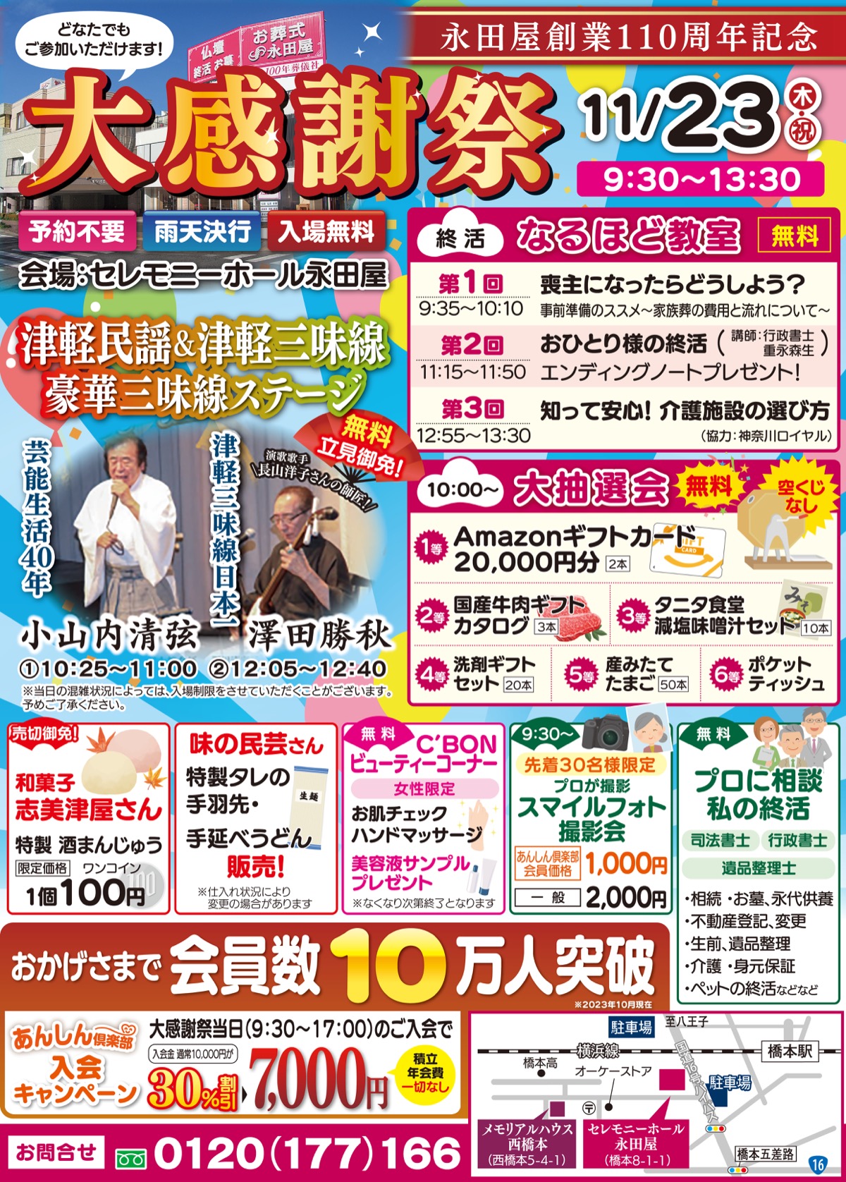 地域密着の葬儀社・株式会社永田屋は11月23日(木・祝)、橋本のセレモニーホール永田屋で創業110周年を記念した『大感謝祭』を開催する。日頃の地域への感謝を込めて行われる大感謝祭。コロナ禍を経て4年ぶりの開催となる。入場無料、予約不要、雨天決行。