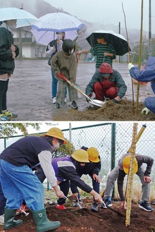 今年、老朽化により校庭の桜が伐採された桂北小。雨が降りしきるなか実施されたセレモニーで、児童会運営委員代表は「今日、2本の桜の木を植えます。200周年になってもきれいな花を咲かせることを願います」と述べた。その後、同委員が2組に分かれて植樹を行った。