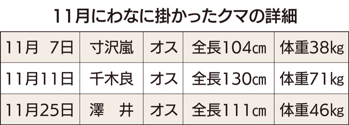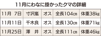 クマは、11月7日寸沢嵐、11日千木良、25日澤井で見つかった。どれもシカやイノシシを捕獲するためのわなにツキノワグマが掛かっていた。現場で対応した同支部の小坂支部長は「イノシシの領域にクマが出没しているということは、人家からとても近い距離で出ているということ」と危機感を口にする。