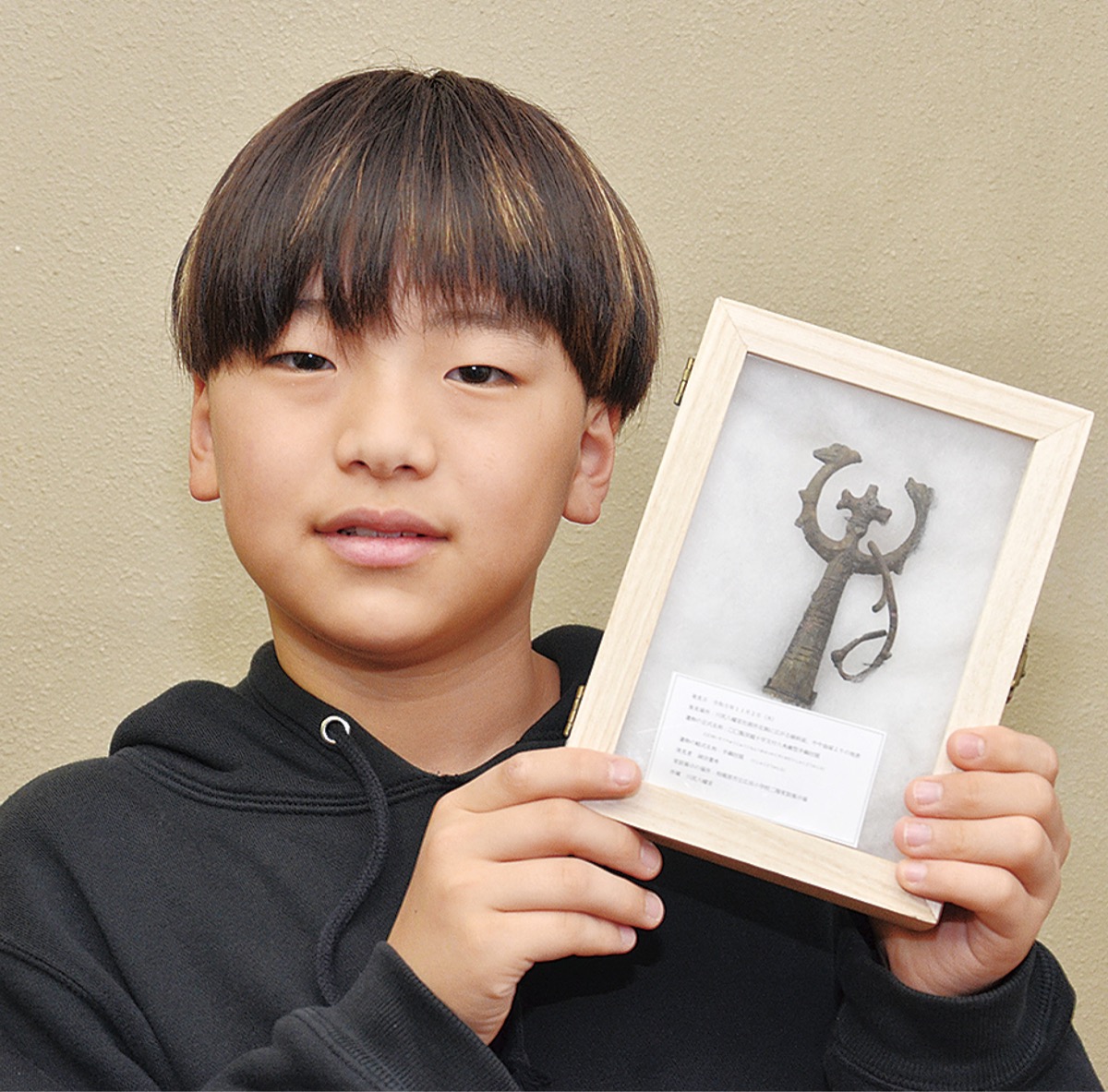 広田小学校の細田蕾希君(6年)が11月に川尻八幡宮の境内で錫杖頭を発見したことを受け、12月5日に同校で関係者が集まり常設展示のための記念式典が開催された。細田君は「ぜひみんなに見てほしい」と貴重な歴史資料の常設展示を喜ぶ。
