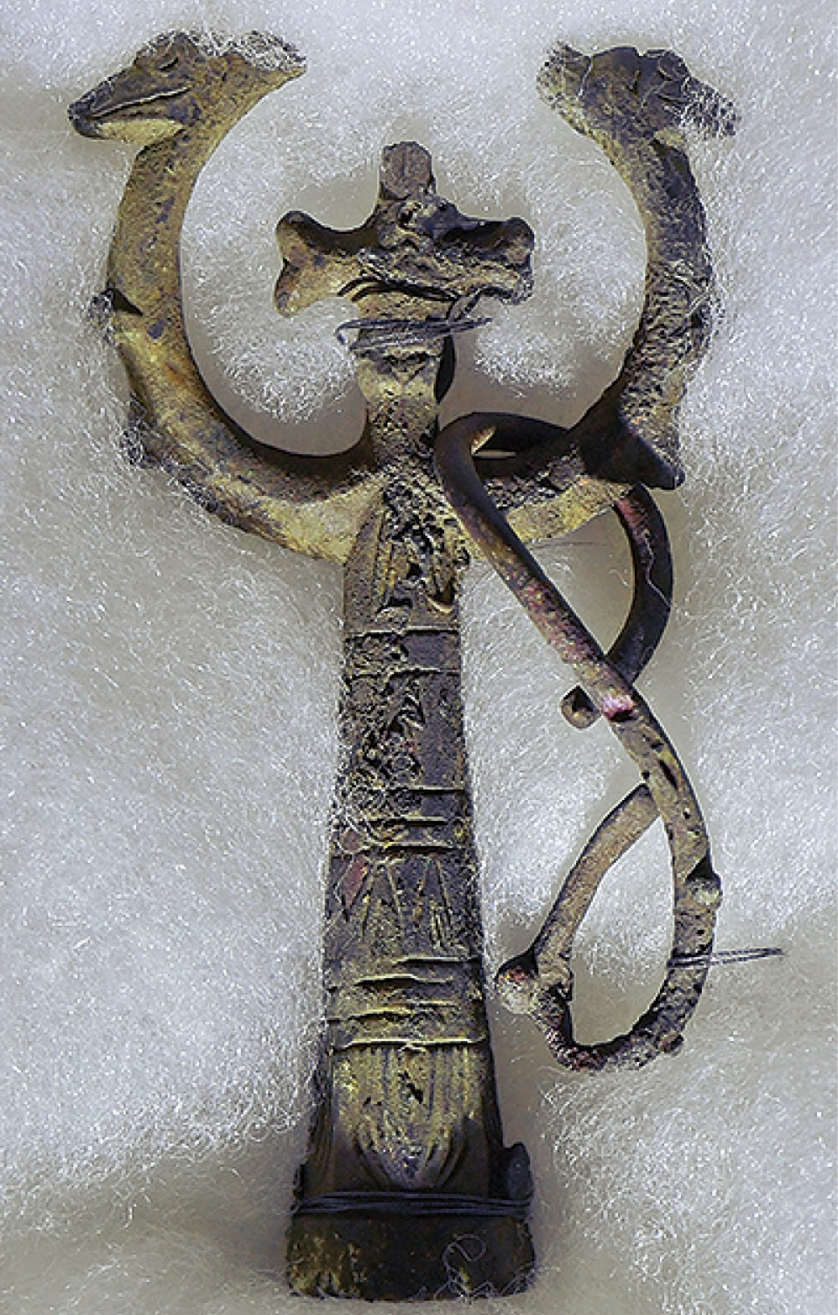 細田君が発見した錫杖頭は全長10cmほど。上部は2頭の龍が向き合っており、その中心に十字文が施されている。下層には八角錐をした金属棒が伸びる。保坂さんは「金属棒の2カ所に釘を通した釘穴が残ることから、おそらく手で握れるほどの木棒があった」と予想。さらに「この錫杖は祭祀用具かと思われる。なぜ土中に埋もれていたのかは不明」と続ける。