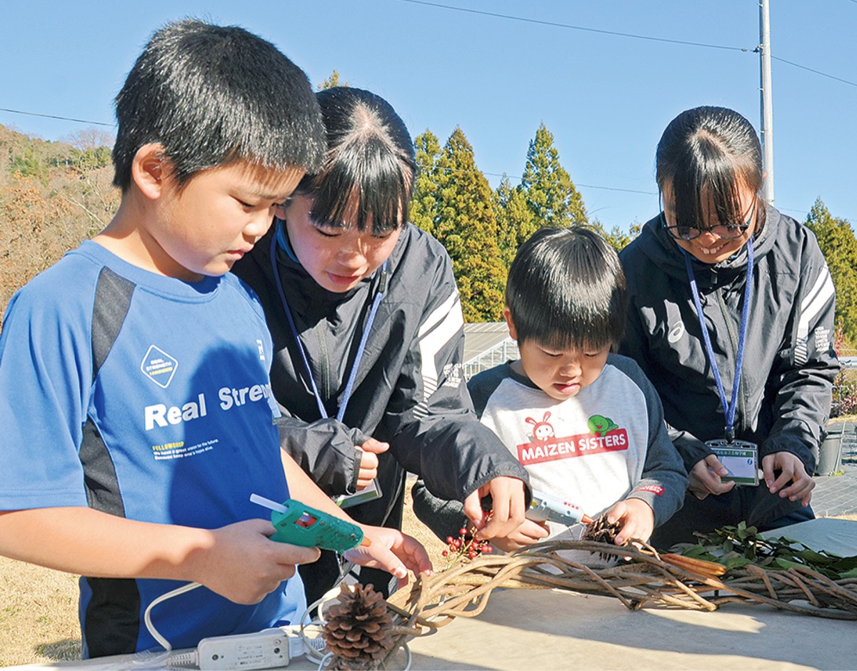 当日は、午前と午後に分かれて開催。午前の部には約20人が参加し、生徒の案内のもとクリスマスリースづくりやたき火で作った焼き芋を食べて交流した。ガーデンツアーも行われ、生徒とベリーガーデンのつながりについても解説していった。リースづくりを担当した伊藤寿々さんは、「最初は地域の方が参加してくれるか心配だったけど、こんなに来てくれてうれしかった」と感想を話した。