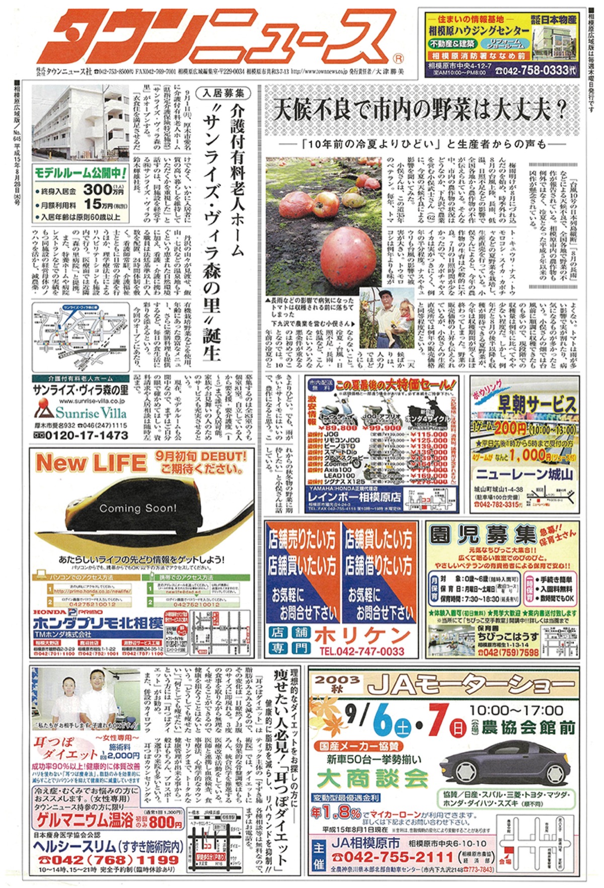 ▼相模原市が中核市の仲間入り(03年4月10日号)▼青学、4月の相模原キャンパス開校以来、初の一般開放でバスケ記念試合(5月22日号)▼都市計画道路古淵麻溝台線が工事再開、16年度中に全線開通(6月19日号)▼少年野球で創部20年の相模ブルーバッズが県大会初優勝(6月26日号)▼市内で初のバレエコンクール開催(7月10日号)▼天候不良で野菜不作。冷夏となった平成5年以来の凶作懸念(8月28日号)▼市内初の一般向け天然ガススタンド開所へ(9月25日号)▼相模原市農業協同組合が創立40周年(10月9日号)▼衆院選、初の分割選挙で14区は藤井裕久氏、16区は亀井善之氏が当選▼市町村合併、1市4町で首長懇談会(11月27日号)▼相模原市場歳末でにぎわう(12月25日号)▼アメフトジャパンXボウルでオンワードスカイラークスが初優勝(04年1月1日号)▼関東ドッジボール選手権で相原キッズが市内初の2連覇(1月8日号)▼津久井3町が相模原市に合併協議申し入れ(1月29日号)▼西橋本に警察署、10月着工へ(2月19日号)▼6日に新小倉橋が開通(3月4日号)