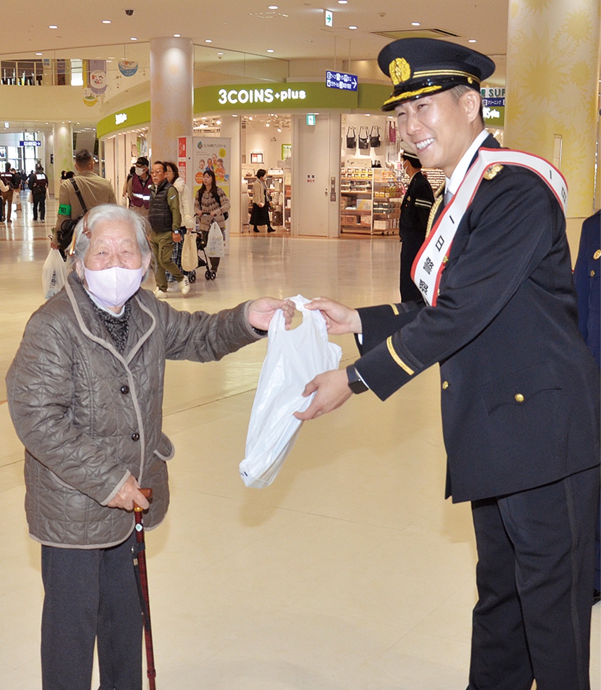 津久井警察署(佐藤宏文署長)は、ダイエー津久井店の駐車場でキャンペーンを実施した。警親会津久井支部や津久井矢車草女性の会のメンバーら約20人が参加。買い物客らに啓発物を配布し、110番の適切な利用を呼び掛けると共に、自転車乗車時のヘルメット着用や詐欺抑止の注意喚起を行った。