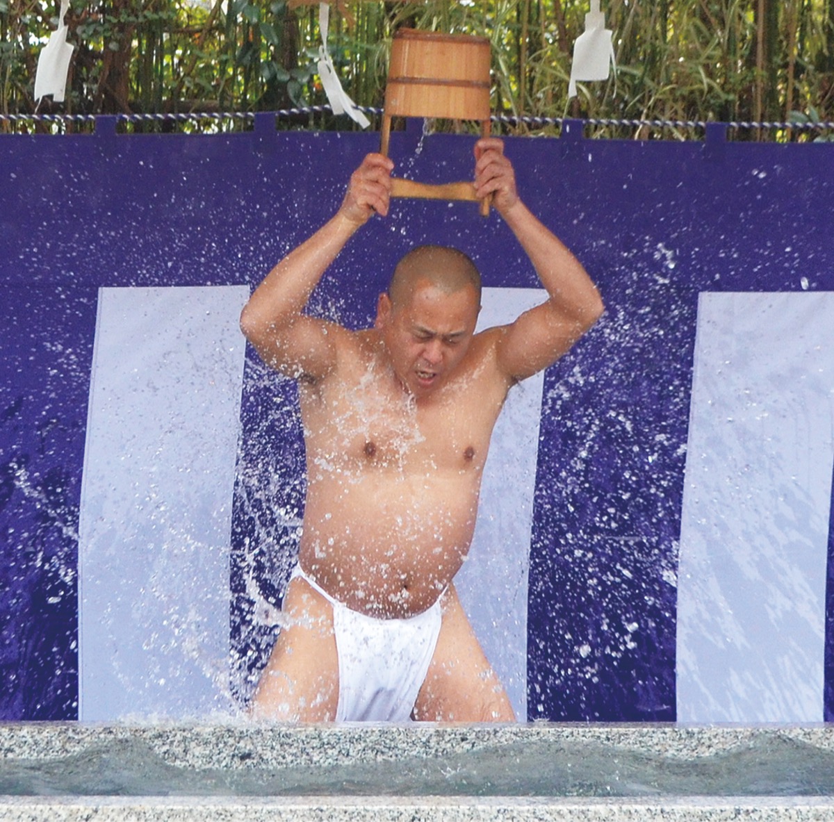 同寺では例年、建築現場での無事故や企業の発展への思いを込めて、この時季に祈祷を実施している。まず、八木功栄副住職が経を唱えながら、境内で冷水を浴びて身を清めた。その後、古橋住職と共に本堂で読経や散華を行い、参拝者の業務安全や商売繁盛、家内安全、心願成就などを祈念した。参拝者らは焼香をしながら手を合わせ、祈りを込めた。