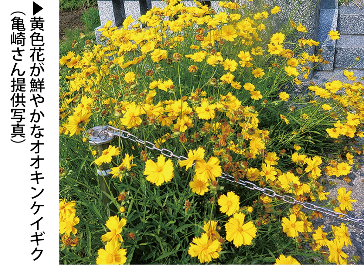 オオキンケイギクは鮮やかな黄色い花を咲かせるキク科の多年草。北米が産地で日本では1880年代から園芸用として販売、植栽されてきた。キバナコスモスに似ているが、花びらの先端がギザギザしていて葉はヘラのような形をしているのが特徴。コスモスは秋に花を咲かせるが、オオキンケイギクは5月〜7月に咲かせる。
