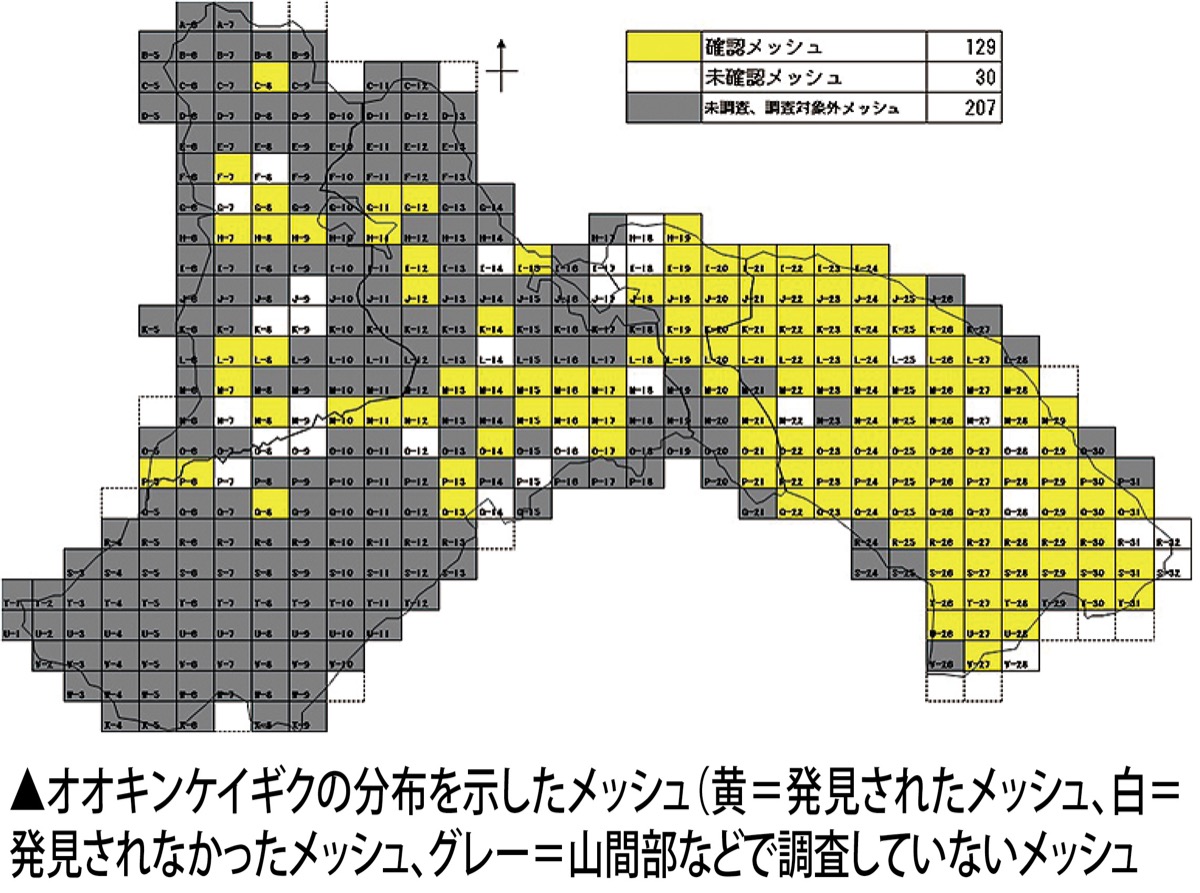 2023年度のテーマに掲げた「オオキンケイギクの分布調査」は4月16日から7月31日にかけて実施。市域を約1キロメートル四方のメッシュに区切り、徒歩や自転車を中心に道端や公園などを見て回った。山間地などで調査が困難なエリアを除いた188メッシュのうち、65人から159メッシュ分の結果を得ることができた。