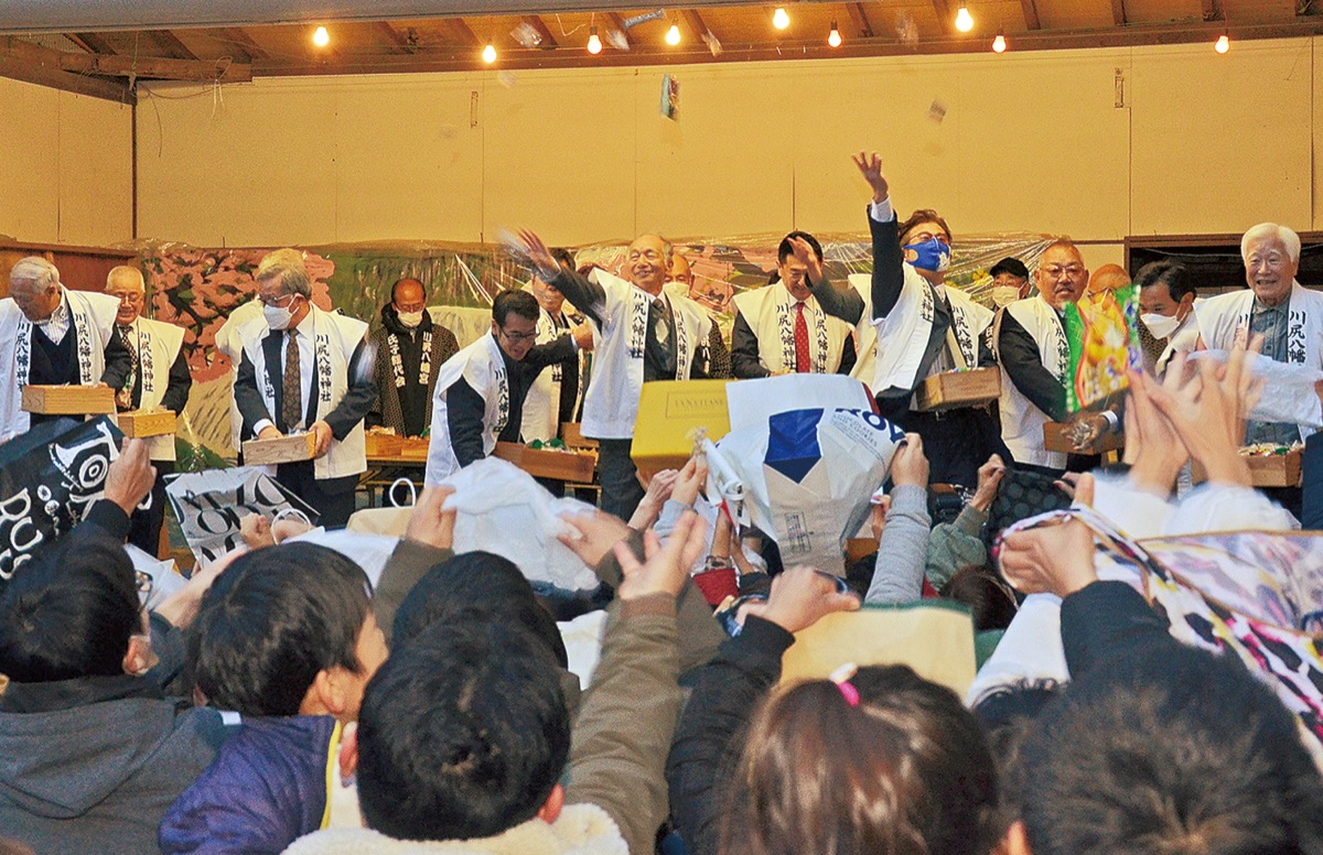 当日は境内に地域住民らが紙袋などを持って集まると、「鬼は外、福は内」の声とともに豆や菓子がまかれた。子どもたちをはじめ参加者は、福をつかもうと興奮した様子で手を伸ばしていた。安西圭市宮司は「皆さんに楽しんでいただけて良かった。一方で能登の方では地震で大変な方もいる。一日も早い復興を願いたい」と話した。