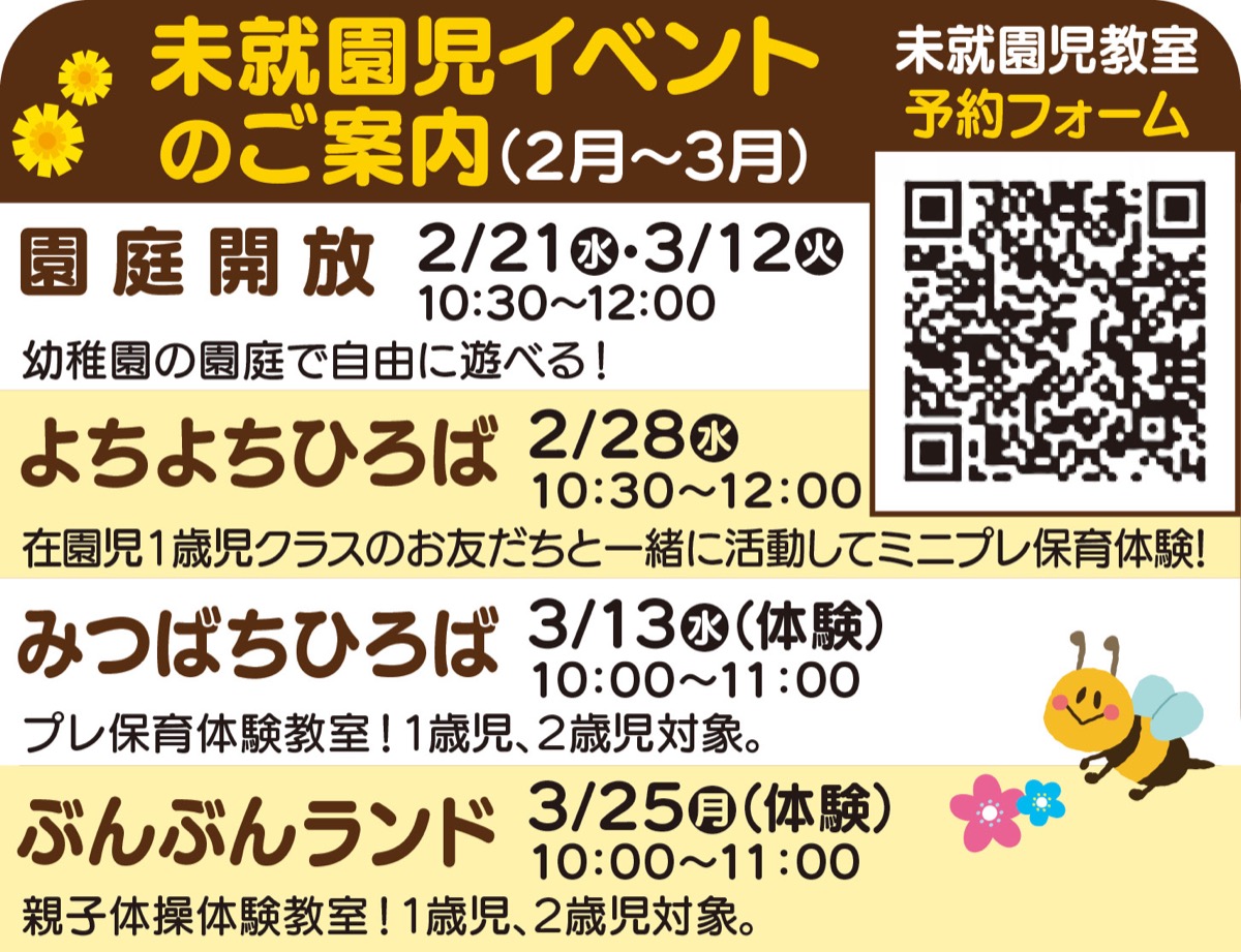 同園では「気軽に幼稚園の環境で楽しんでほしい」と毎月園庭を開放。同年齢の子どもたちの遊び場だけでなく、保護者同志がコミュニケーションをとる場にもなっている。月1回の「よちよちひろば」や「ぶんぶんランド」、週1回の「みつばちひろば」など、無料で体験できるイベントも企画。「親子で楽しい時間が過ごせますよ。一度、幼稚園に足をお運びください」と中山園長。