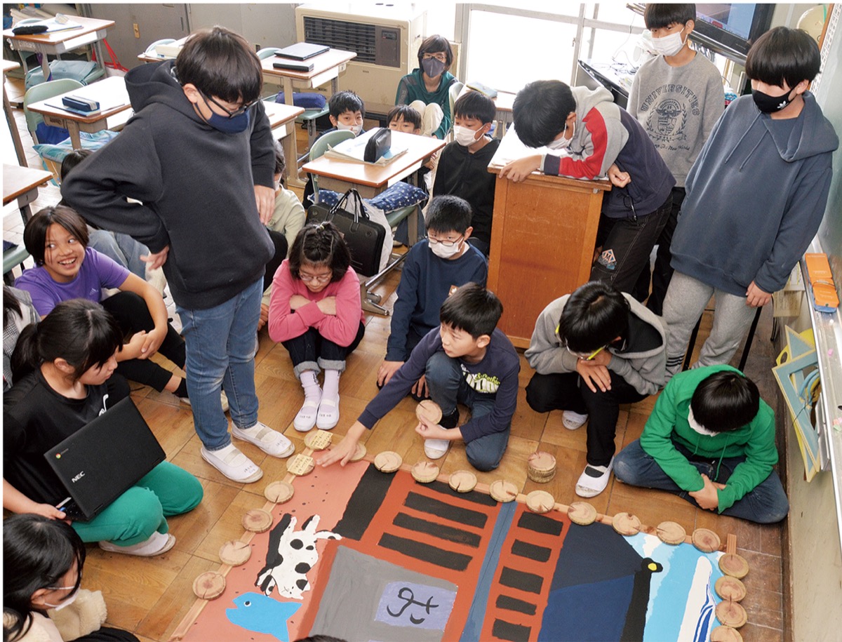 児童は夏休み前から構想やデザインを練り、制作には9月から取り掛かった。絵画、マップ、絵画を囲む額縁の3グループに分かれて制作を進めている。絵画は縦1・5m、横2m。原案はそれぞれが描いた中から1枚を全員で選んだ。採用された塚本陽真さんは「昔からある橋本を分かりやすく表現した。自分の絵が選ばれてうれしい」と話す。
