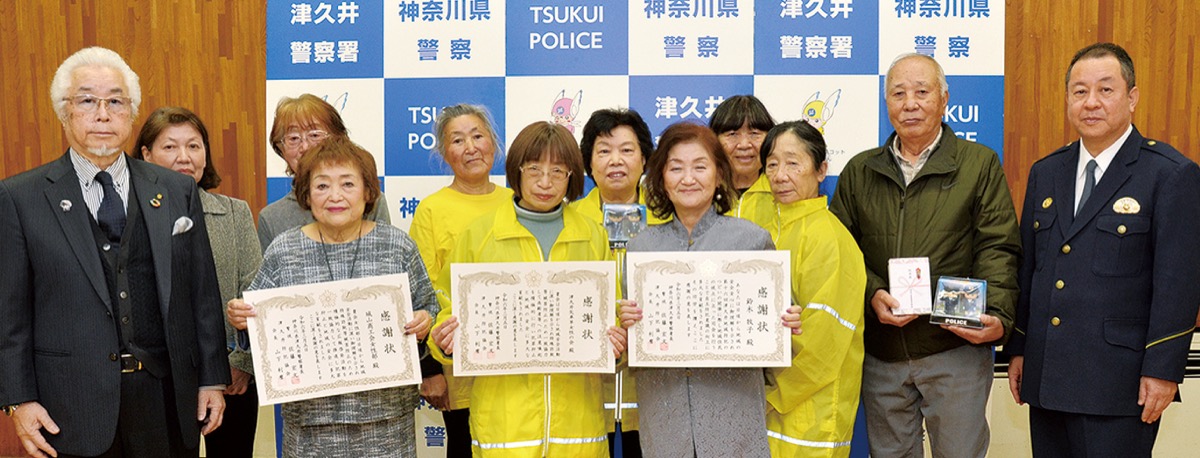 感謝状を受け取ったのは城山商工会女性部、津久井矢車草女性の会、鈴木牧子さん。同女性部はイベントなどで振り込め詐欺の寸劇を披露し啓発に努め、同会は年金支給日に金融機関で注意を呼び掛ける活動を継続している。鈴木さんは昨年の防犯のつどいで司会を務めイベントを成功に導いたことを受け、それぞれに感謝状が贈られた。