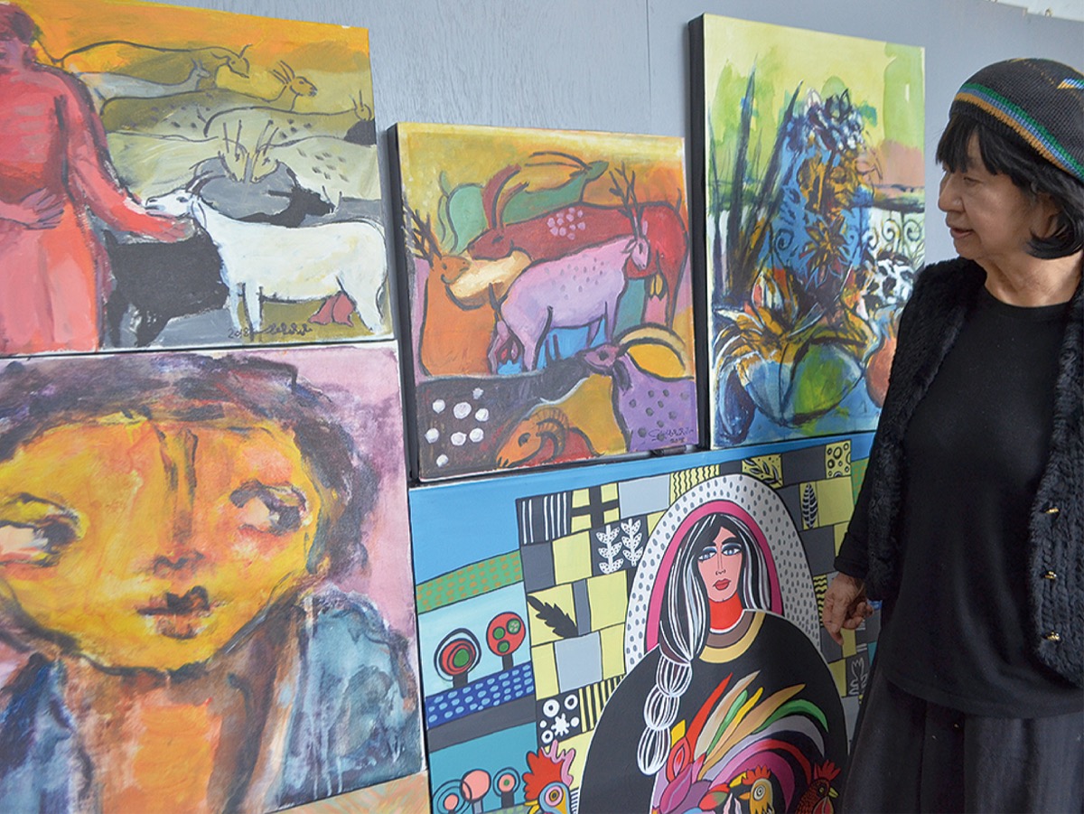1999年にパレスチナで開かれたグループ展への参加をきっかけに、難民キャンプでの絵画指導支援などを20年以上続けてきた上條さん。昨年からのイスラエル侵攻でがれきの山となったガザの映像を見る度、心が痛むという。ガザに住む7人の画家のうち、連絡が取れたのは1人だけ。6人の消息は今も不明のままだ。上條さんは「彼らはこの状況をどう生き抜くのか。考えただけでも残酷でむご過ぎる。人殺しも戦争もやめて」と切実な声を上げる。今回は7人が侵攻以前に描いた作品、約30点を展示。会場ではパレスチナ刺繍やビーズを販売。売り上げは全て寄付される。