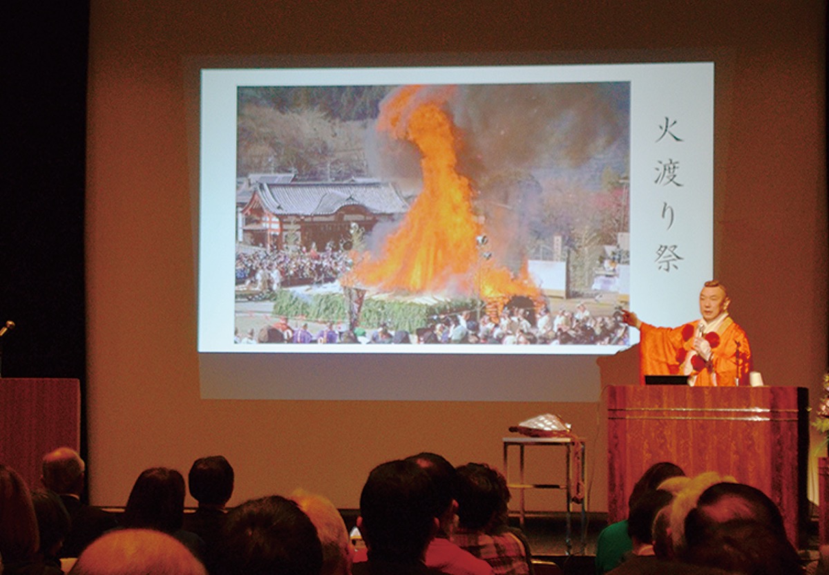 高尾山(八王子市)にある寺院「高尾山薬王院」の貫首(かんす)、佐藤秀仁僧正を招いての観光まちづくりセミナーが2月29日、杜のホールはしもとで開催された=写真。
