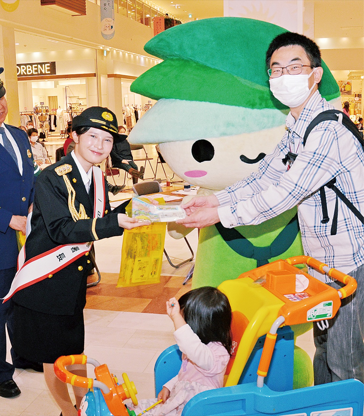この日は、二ツ目の落語家で相模原市出身の鈴々舎美馬(れいれいしゃみーま)さんが1日署長として登場。美馬さんは、「交通安全に貢献できるように努めたい」とあいさつし、この日のために作った新作落語を一席披露した。その後、関係団体のメンバーらが啓発チラシなどを買い物客に手渡した。