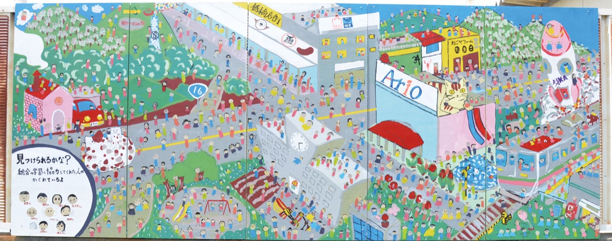 この巨大画は「住み良いまちづくりをしよう」をテーマに総合的な学習の授業に取り組んできた児童が、「関わった人や事柄を一目で分かるようにしたい」と企画。区内で活動するアートディレクターの武笠太郎さんの協力を得て制作した。
