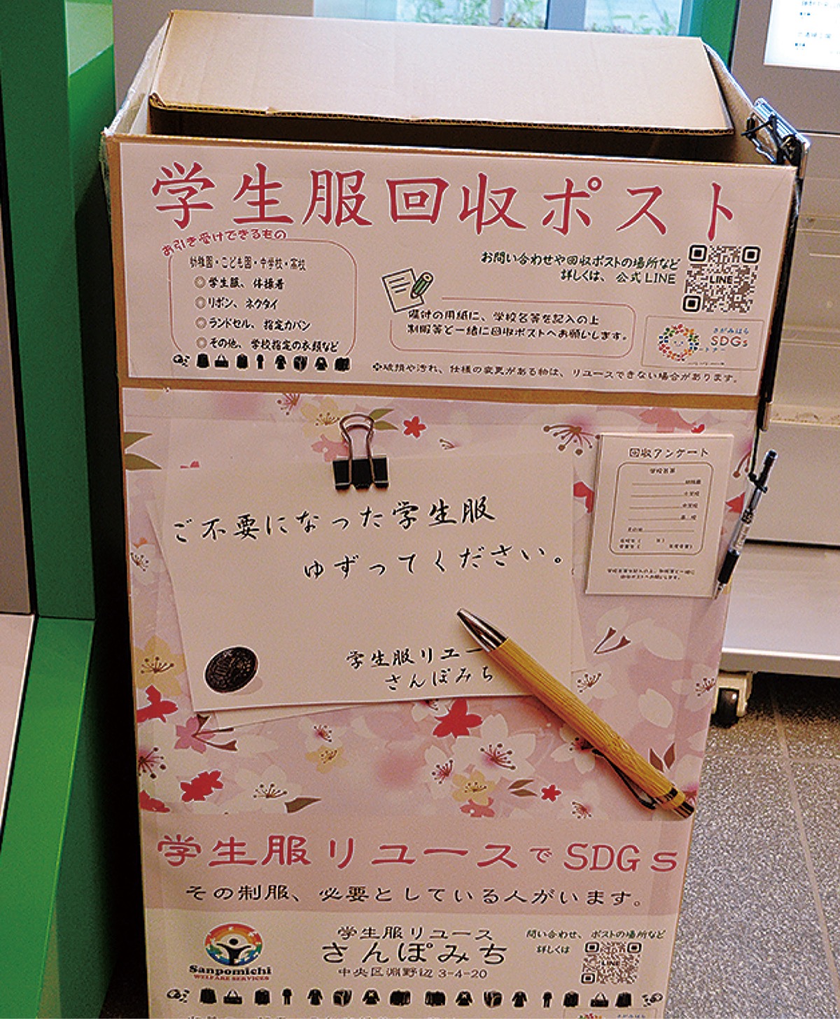 不要となった学生服の寄付を受け付ける回収ボックスが、緑区役所をはじめ、市内各区役所の1階ロビーに設置されている。設置期間は5月31日(金)まで(通年設置している公民館・まちづくりセンターもあり)。