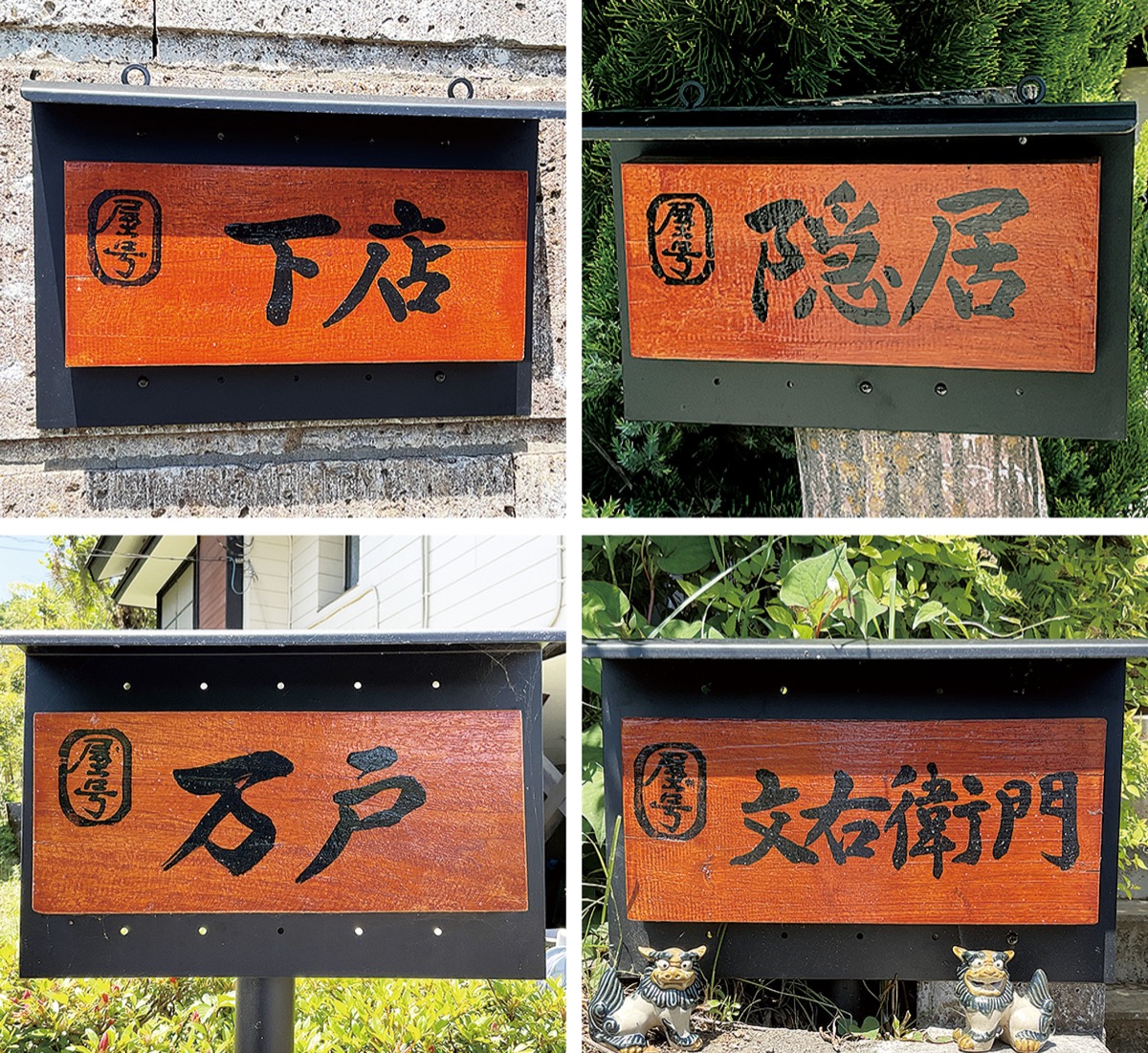 「下店」「文右衛門」「万戸」「隠居」といった一風変わった表札。これは藤野地区の名倉で地域の親睦と発展に貢献したいと活動するなぐら談会(野崎勝也会長)が始めたもの。屋号を表札にしたもので、現在は22軒の表札がある。野崎会長は「名倉地域全体に広まって地域が盛り上がれば」と話す。