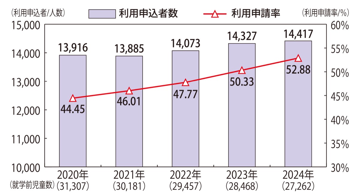 保育所等利用申込者数は1万4417人(前年比90人増)、利用申請率は52・88%(同2・55ポイント増)に上り、いずれも過去最多を記録した。少子化が進み、市内でも就学前児童数が減少しているものの、保育ニーズは高まっている。