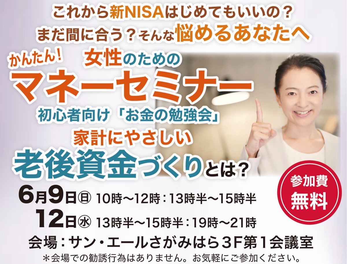 サン・エールさがみはら(西橋本5の4の20)で6月9日(日)と12日(水)、「女性のためのマネーセミナー〜家計にやさしい老後資金づくり〜」と題した勉強会が開催される((株)ライフクリエイト主催)。時間は9日【1】10時〜12時【2】13時30分〜15時30分、12日【1】13時30分〜15時30分【2】19時〜21時。
