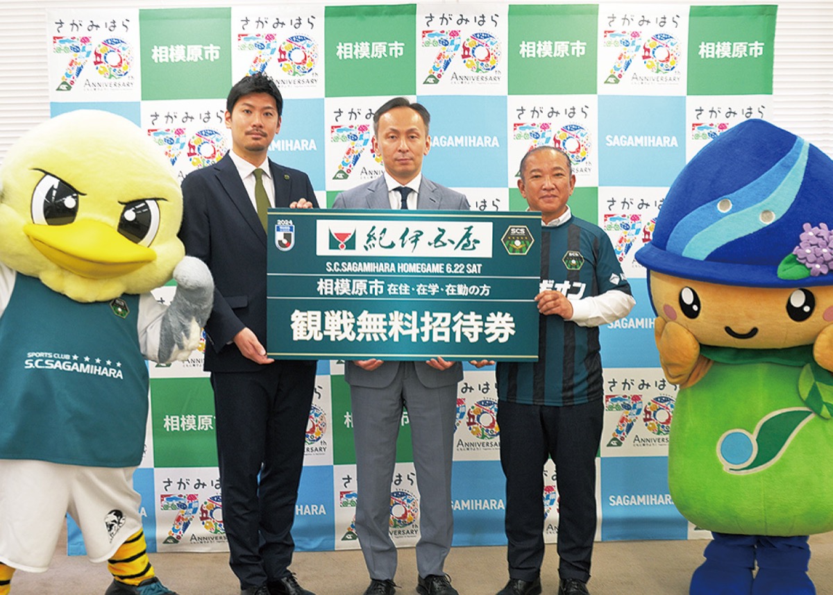 5月15日に市役所で行われた招待券の贈呈式には、本村賢太郎市長、SC相模原の西谷義久社長らが出席した。