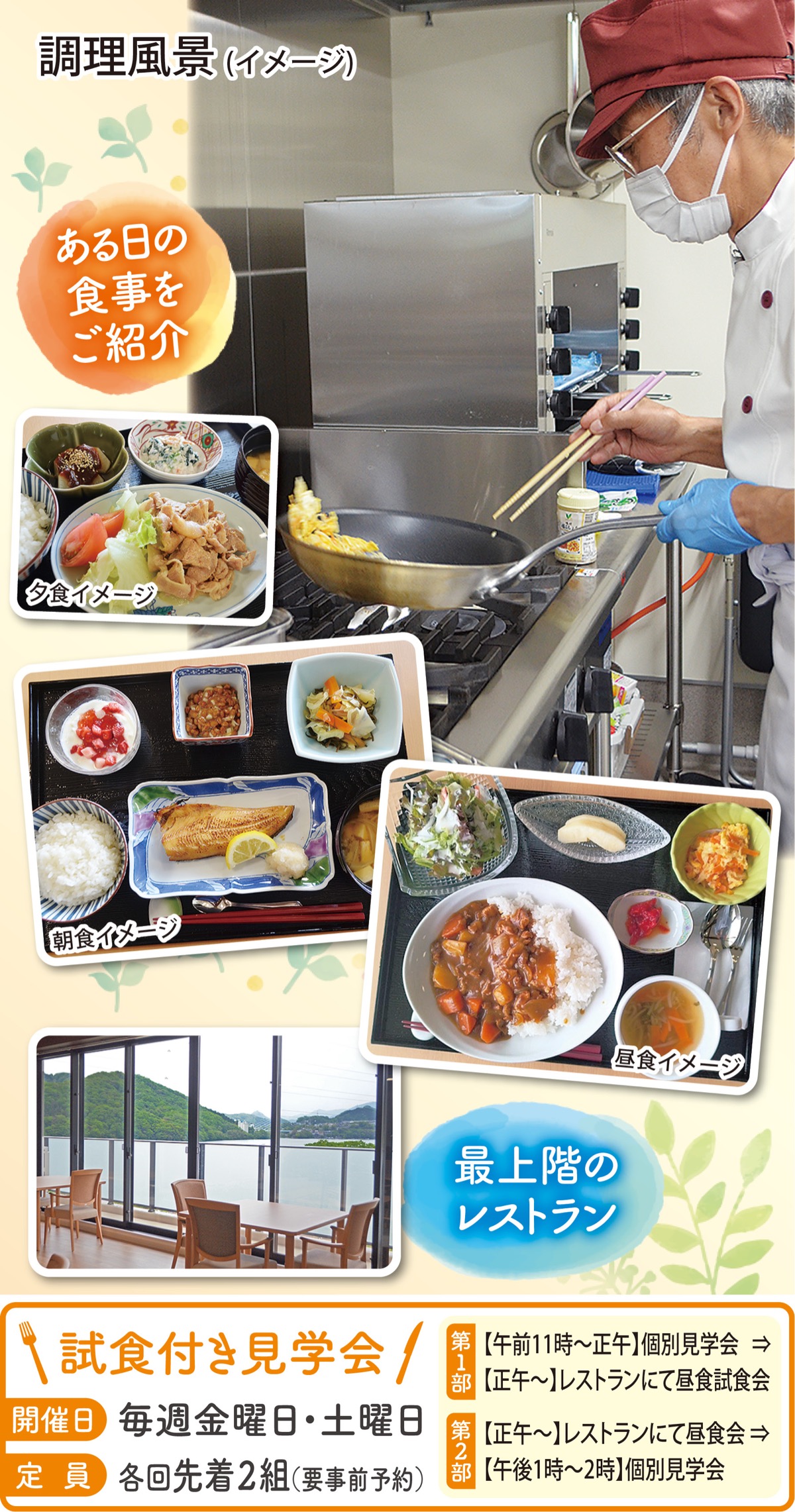 現在、施設見学だけではなく実際の食事を試せる「試食付き個別見学会」を毎週金曜日と土曜日に実施(日程は左記参照)。「施設をより知ることができる」と好評だ。参加無料、各回先着2組限定(要事前予約)。