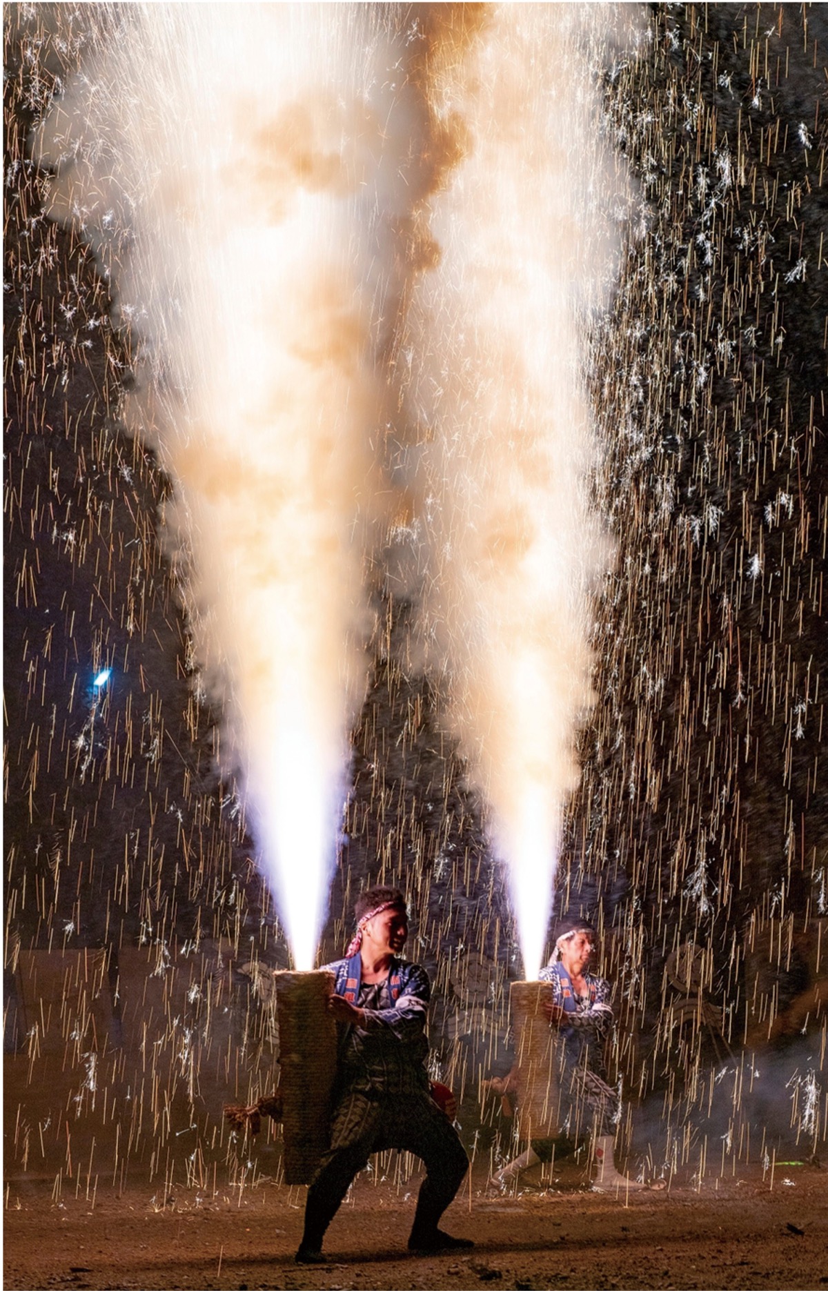 揚げ手が長さ80cmほどの竹筒を脇の横に両手でかかえるように持つ。竹筒からは勢いよく火柱が噴出され、辺りは火花と煙と大音響に包まれる―。この様子を十数メートルという至近距離で体感できるのが、この花火の醍醐味だ。
