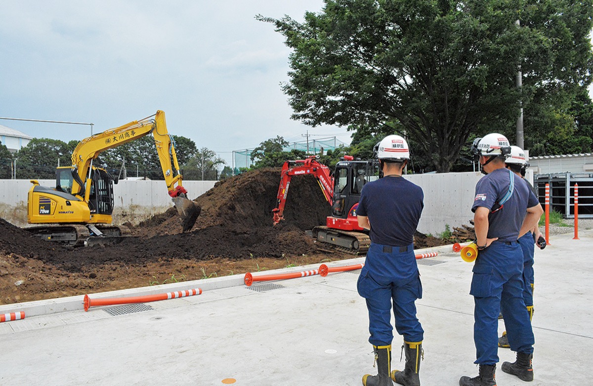 相模原消防署緑が丘分署(中央区緑が丘)には消防庁から貸与されている重機1台がある。当日はその重機と業者が用意した重機を使用し、土砂運搬作業を実施した。1台が土砂を崩し移動し、もう1台がそれをダンプに乗せる場面を想定。消防士は日ごろから重機を扱う業者の実用的なアドバイスを受けながらおよそ2時間、連携しながら進めた。