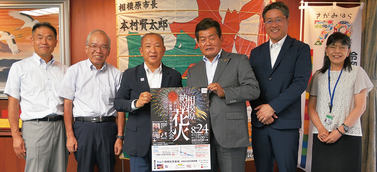 相模原納涼花火大会が8月24日(土)、相模川高田橋上流(中央区水郷田名)で行われる。大会実行委員会は7日、相模原市役所で本村賢太郎市長に開催の報告をした。