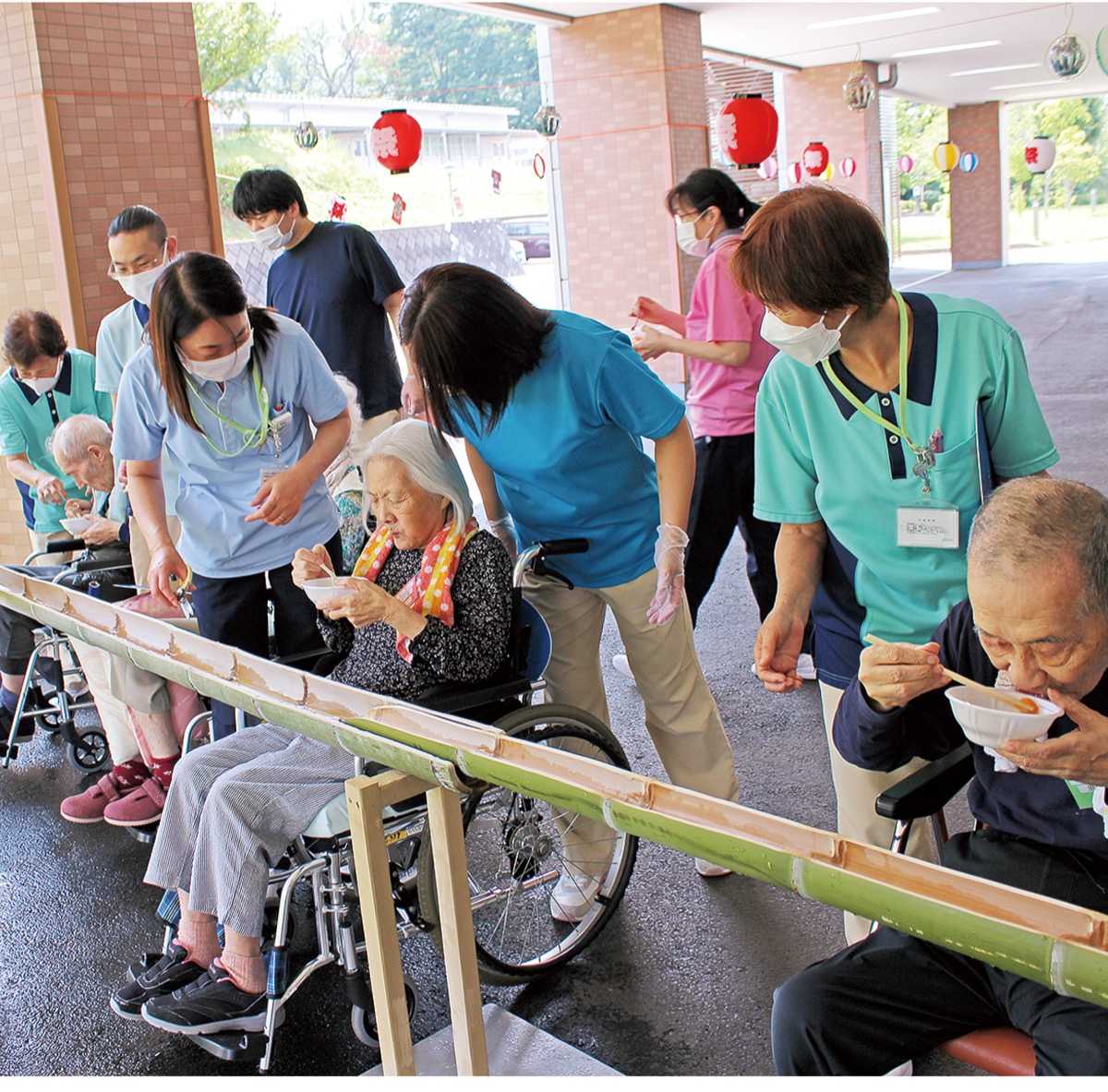 入居者に季節を感じてもらいたいと行われた企画。施設内に設置された約20mの竹筒から勢いよく流れてくるそうめんを入居者はすくうと、笑顔で味わっていた。
