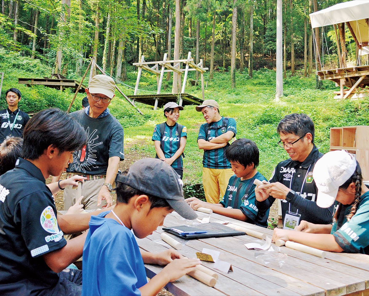 この日、森の中で現役の福井和樹選手(MF・23歳)らと津久井産材を使った打楽器・クラベスづくりや選手とのトークタイムを楽しんだ参加者たち。「木を削るのが大変だった。選手に質問できてよかった」(新宿小5年・武藤充輝さん)、「選手たちと近い距離で話ができてうれしかった」(二本松小5年・村上航大さん)とそれぞれ感想を語った。最後は森に隣接したカフェで森林浴ファシリテーターの青木薫さんが、森林の働きや整備についてスライドを用いて説明。時折、メモを取ったり、頷く人の姿も見られた。