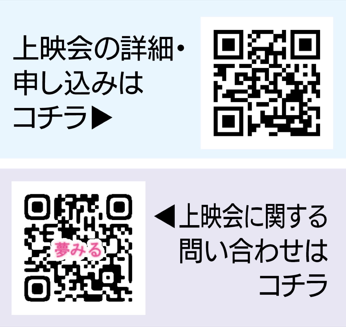 上映会は2部制で午前は10時30分から、午後は2時から。午後の部の終了後のみ交流会を開催。入場は大人1000円、高校生以下無料。定員は先着順で各回200人。申し込み、問い合わせは二次元コードから。