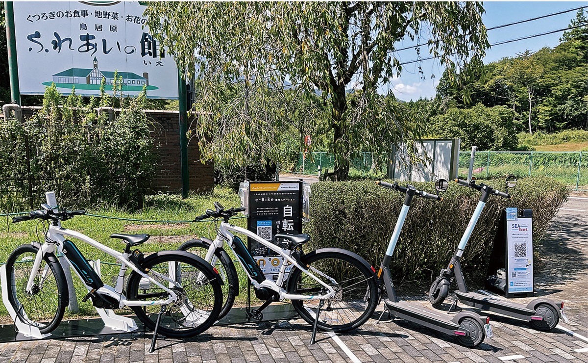 宮ヶ瀬湖周辺地域の回遊性を高めるため、神奈川県は9月1日から鳥居原ふれあいの館(鳥屋1674)に電動キックボードとスポーツ型電動アシスト自転車(E-Bike)のステーション(乗降ポイント)を設置し、マイクロモビリティの実証実験を行っている=写真。