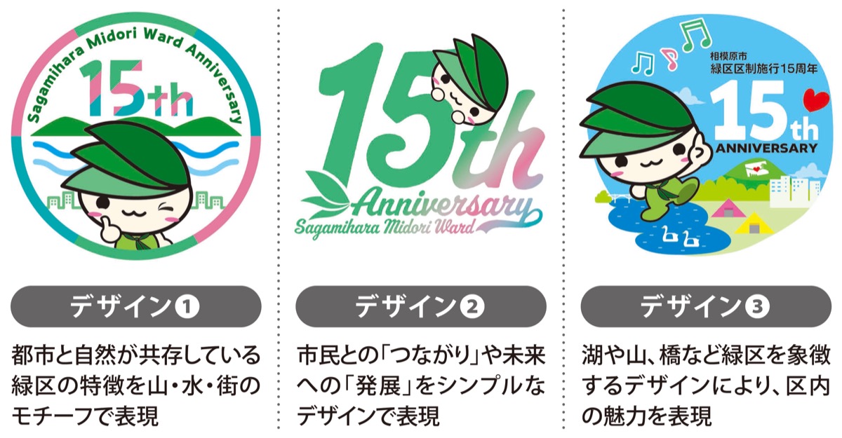 今回、候補にあがっているのは3つのデザイン。それぞれ緑区のイメージキャラクター・ミウルが描かれており、「15」の文字が強調されている。