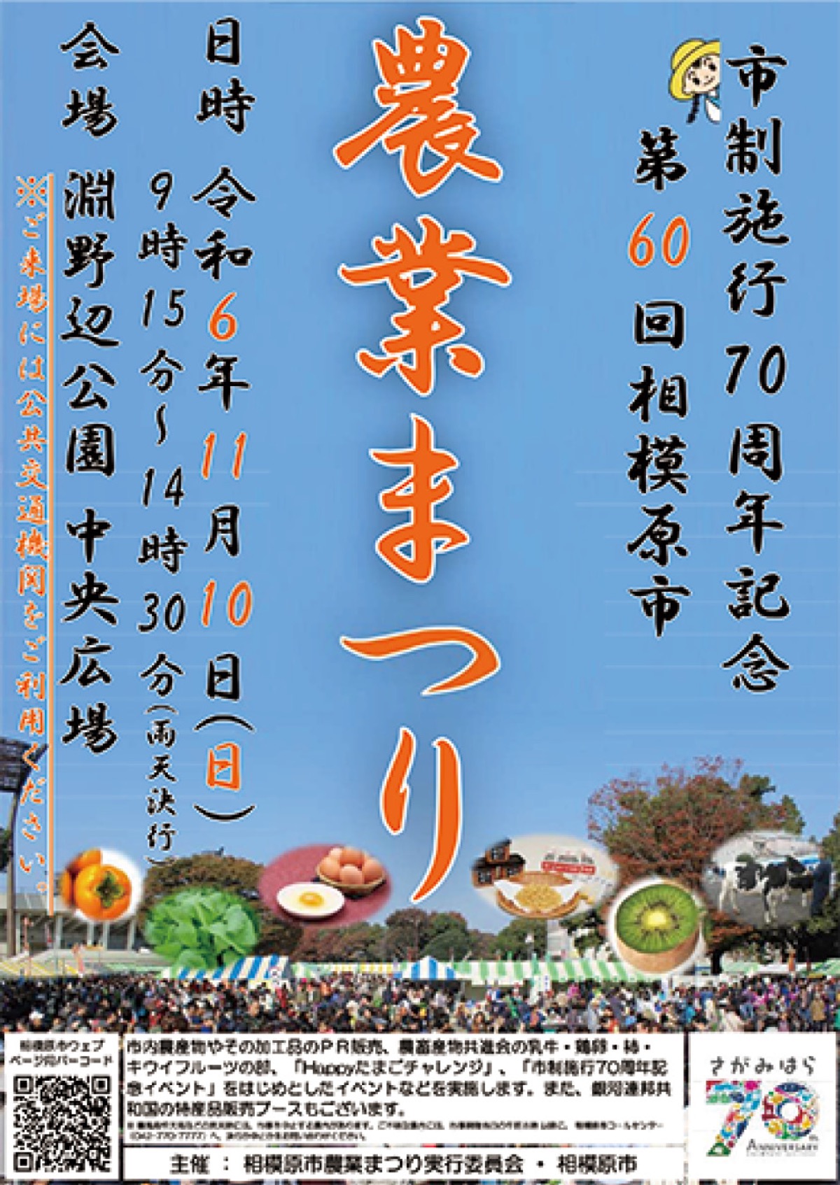 60回目を迎える恒例の農業まつり。新鮮な野菜や果物、手作りハム、花、漬物などが販売される。乳牛や鶏卵、柿などを品評する共進会も開催され、会場では乳搾りの体験もできる。その他、市制施行70周年を記念したイベントや、市内の小学生による総合学習の成果発表、つかんだピンポン玉の色で当たる卵の数が決まる「Happyたまごチャレンジ」などさまざまなイベントが予定されている。