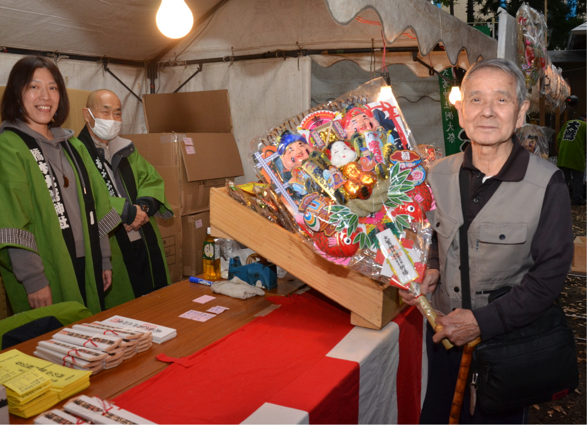 「名物の熊手を購入しに訪れた」という西橋本でモーターの修理、販売などを手掛ける大川原電機の大川原勝さんは「商売繁盛と健康を願って50年近く毎年ここで熊手を購入している。ご利益がありますように」と笑顔を見せた。
