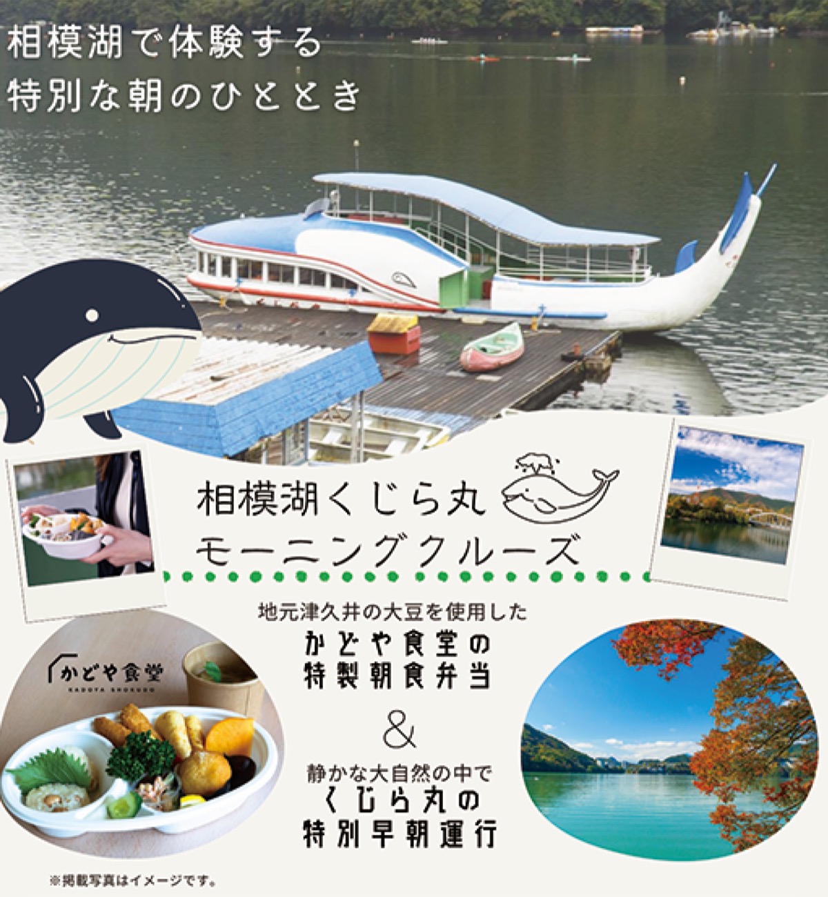モーニングタイム1つ目のプランとして紹介されたのが「相模湖くじら丸モーニングクルーズ」と題した期間限定のプラン。相模湖・相模原流域エリア唯一の早朝プランで、早朝の相模湖で遊覧船・くじら丸に乗船しながら、相模湖駅前・かどや食堂の特製朝食弁当を食す、という内容だ。実施期間は11月28日(木)から12月15日(日)の予定。