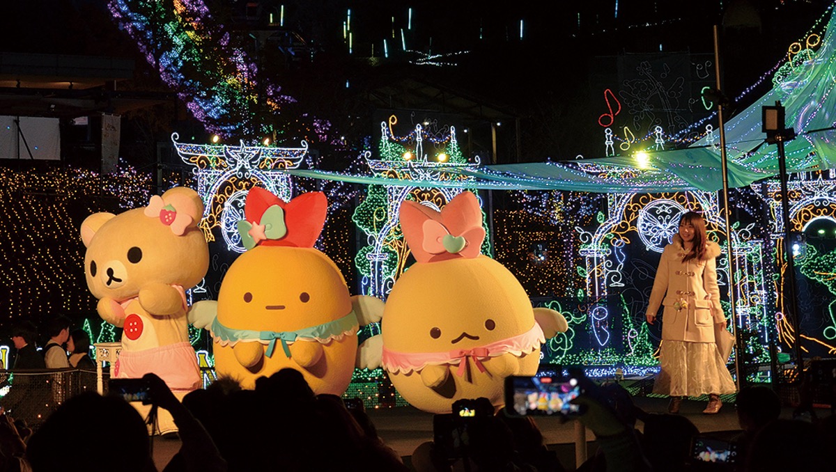 16日の点灯式では、サンエックスのキャラクター、コリラックマとえびふらいのしっぽ、えびてんのしっぽが登場。約300人の来場者が見守る中、「ライトアップ」の掛け声を合図に園内が一気に色付いていった。来場者から大きな拍手が起こると「キレイだね」「すごい」などといった声が聞かれ、写真撮影を楽しむ家族などの姿が見られた。