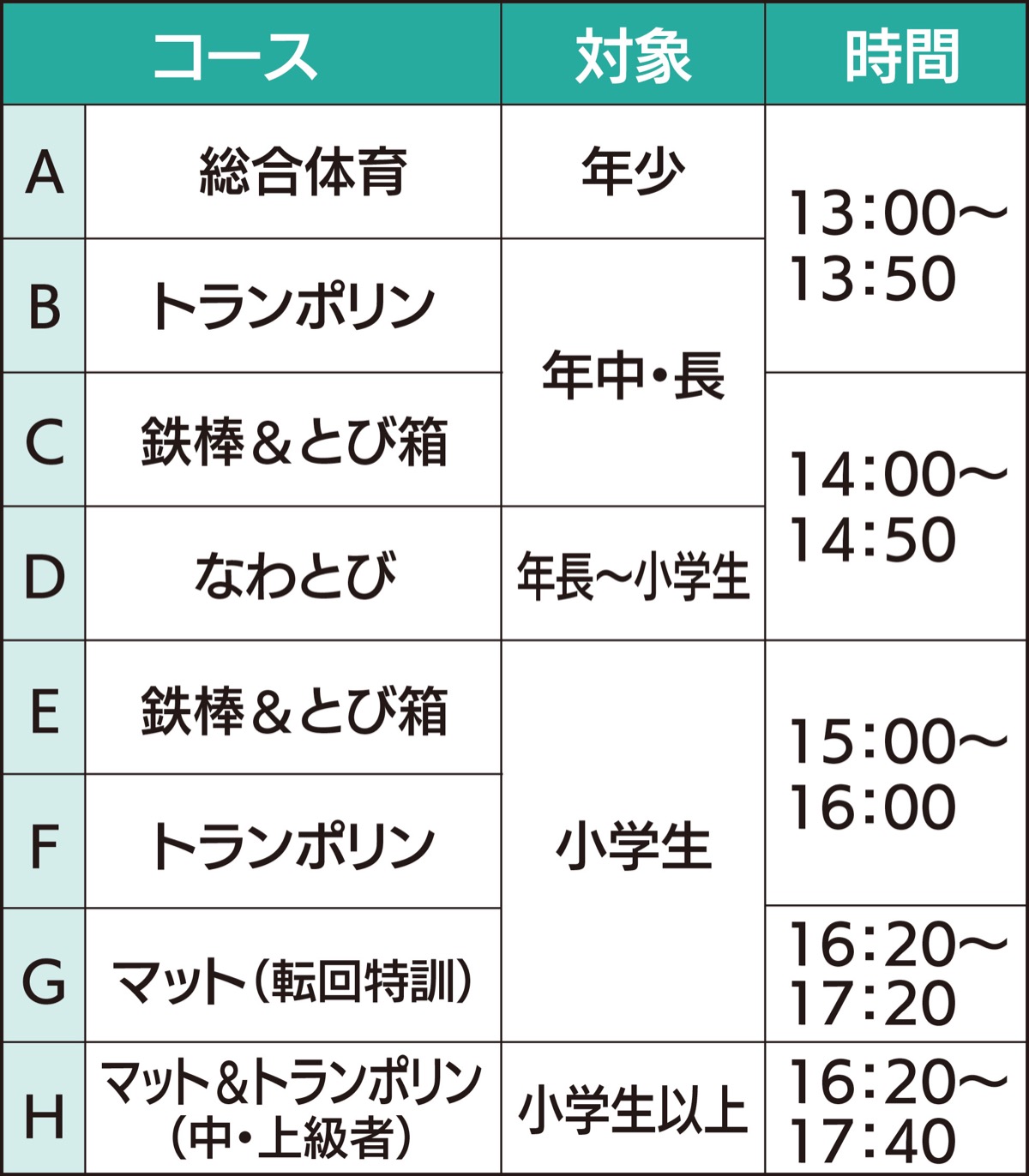 年少から小学生を対象にした3日間の体操教室。年代や時間ごとに8つに分かれ、「総合体育」「トランポリン」「鉄棒&とび箱」「なわとび」「マット(転回特訓)」の各コースがある。同クラブでは「どんどんチャレンジしてみよう」と参加を呼び掛ける。