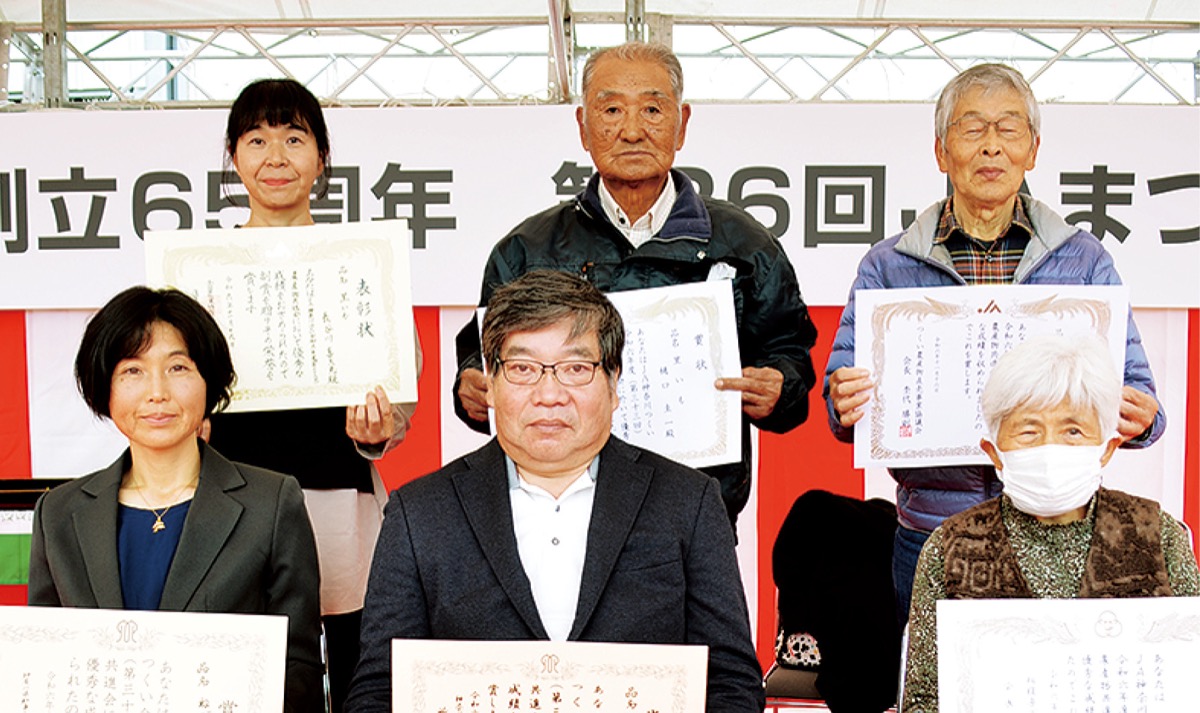 また、ステージでは前日行われた「第33回農産物共進会」の褒章授与式も実施。今年は、昨年よりも44点多い384点が出品され、優等に選ばれた7品の生産者が表彰された。