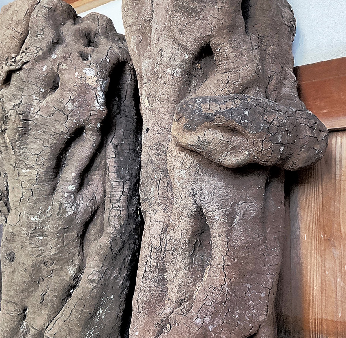 「蛇の樹」とは、川尻八幡宮の境内にあったヒサカキの木のこと。幹に巻き付くツルがヘビのように見えたことから、地域の人を中心に親しまれてきた。ある時から賽銭が置かれるようになるなど、訪れる人も増えていったが、数年前に木の老朽化により、安全上の観点から伐採。幹の部分だけは厳重に保管していたという。