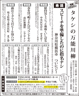 タウンニュース相模原支社では毎月月末号に掲載される「タケシの万能川柳」の川柳を募集しています。投句いただいた作品は毎日新聞「仲畑流万能川柳」などでおなじみの水野タケシさんが選句します。応募方法は枠内に。