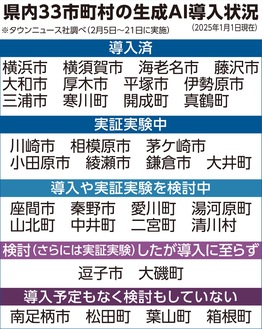 人工知能(AI)を用いて文章や画像を作成する生成AIが世界的に普及する中、業務に導入する自治体が増えてきている。神奈川県内33市町村のうち、導入済が12市町村、実証実験中を合わせ6割近い19市町村で生成AIを利用していることが、タウンニュース社の独自アンケート調査で明らかになった。