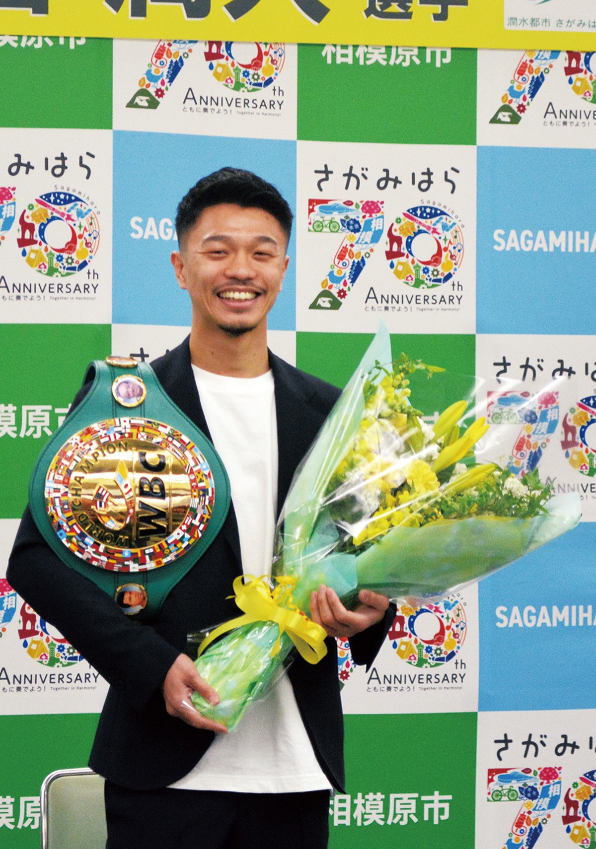 市内在住でWBC世界バンタム級王者の中谷潤人選手が3月29日、3度目の防衛成功を果たした報告会に登場した。会場となった市役所本庁舎本館1階ロビーには市内外から約200人のファンが集まった。